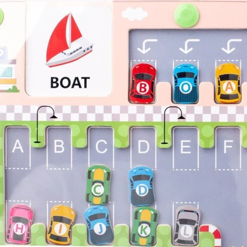 This set includes 15 double-sided cards, each with 2 words on the reverse, giving your child 30 words to explore. Your child can place the cards into the board and use the cars to move and form the words, helping to reinforce letter recognition, spelling, and vocabulary in a fun, interactive way.
