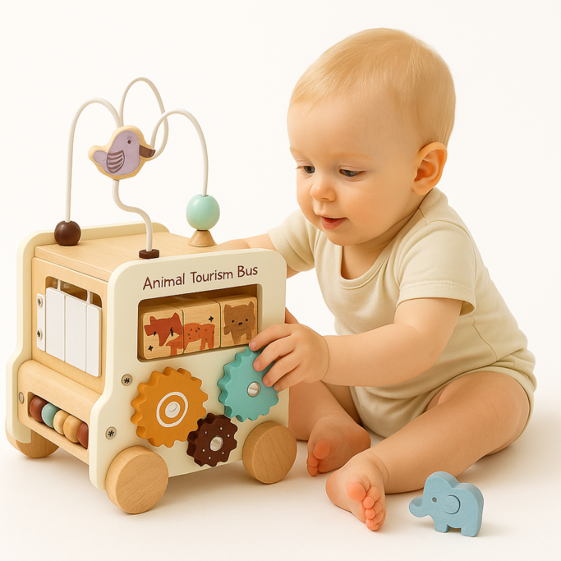 Made entirely from natural wood, this multi-activity toy combines nearly a dozen Montessori-inspired challenges — rotating gears, shape matching, music play, counting beads, and more — giving your child the ultimate early-learning experience in one beautiful toy.