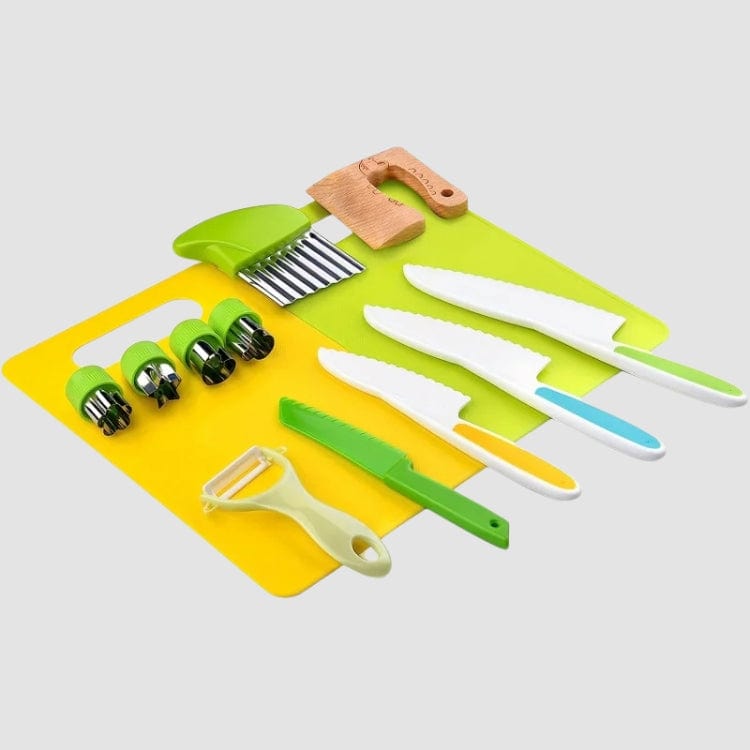 - Contains: (4) knives, (4) dough molds, (2) cutting boards, (1) peeler, (1) crinkle cutter, (1) wooden cutter